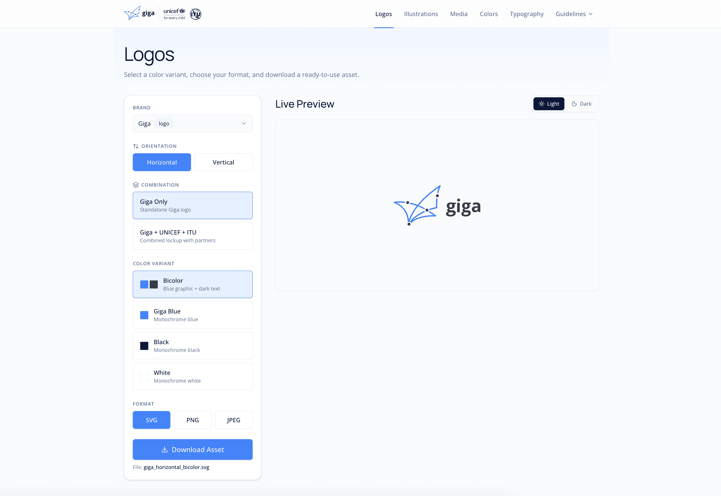 1. Logo library with contextual guidance A browsable library of all Giga logo variants (color, white, black, monochrome) with contextual labels explaining when to use each. One click to preview, one click to export in SVG, PNG, or PDF.